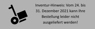 Bitte beachten Sie, dass Bestellungen nur dann rechtzeitig zu Weihnachten ausgeliefert werden können, wenn sie bis zum 19. Dezember aufgegeben werden. Alle Bestellungen nach diesem Datum werden ab dem 5. Januar 2025 bearbeitet. Vielen Dank für Ihr Verständnis und Ihre Treue!